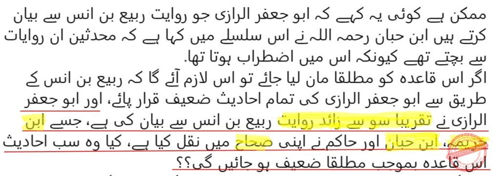 ”اگر اس قاعدہ کو مطلقا مان لیا جائے تو اس لازم آئے گا کہ ربیع بن انس کے طریق سے ابو جعفر الرازی کی تمام احادیث ضعیف قرار پائے، اور ابو جعفر الرازی نے تقریبا سو سے زائد روایت ربیع بن انس سے بیان کی ہے، جسے ابن خزیمہ، ابن حبان اور حاکم نے اپنی صحاح میں نقل کیا ہے، کیا وہ سب احادیث اس قاعدہ بموجب مطلقا ضعیف ہو جائیں گی؟؟“